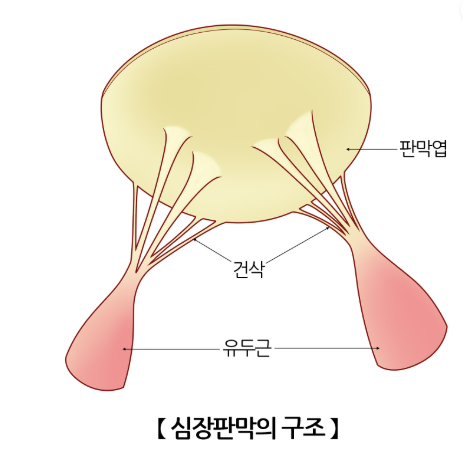 삼천판은 세 개의 판막(leaflets)으로 구성되어 있습니다. 각 판막은 어깨 모양을 하고 있으며, 각 판막은 우심방과 우심실을 연결하는 부분에 위치해 혈류가 원활하게 통과하도록 돕습니다. 이 세 개의 판막이 함께 협력하여 혈액의 흐름을 조절하고, 역류를 막는 데 중요한 역할을 합니다.