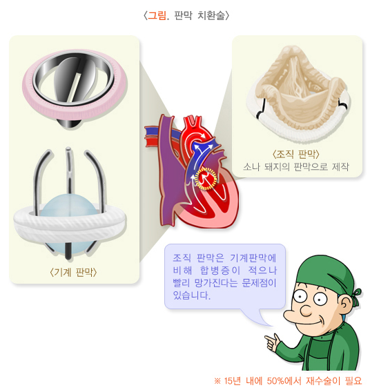 - 기계식 판막 또는 생체 판막을 사용하여 기능을 대신합니다. 기계식 판막은 내구성이 높고 장기적으로 사용 가능하지만, 항응고제를 꾸준히 복용해야 하는 단점이 있습니다. 반면, 생체 판막은 자연에 가까운 기능을 하지만 내구성이 낮아 다시 교체해야 할 수 있습니다.