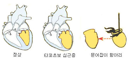 - 이러한 변화는 타코츠보 항아리와 유사한 모양을 형성하기 때문에, 이 질환은 일본어에서 "타코츠보"라는 이름이 붙었습니다. ‘타코’는 문어를 의미하고, ‘츠보’는 항아리를 의미하는데, 문어를 잡을 때 사용하는 항아리처럼 심장의 모양이 바뀌기 때문입니다.