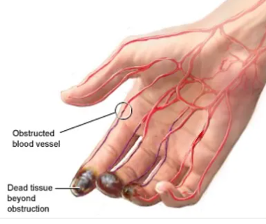 - 혈액 공급이 완전히 차단되면 손가락이나 발가락의 조직이 죽는 괴사 현상이 발생할 수 있습니다.