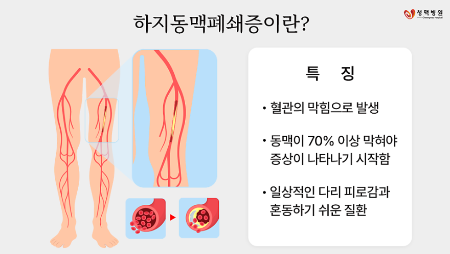 하지동맥폐쇄증(Peripheral Arterial Disease, PAD)은 다리로 가는 동맥이 좁아지거나 막혀서 혈액의 흐름이 감소하는 질환입니다. 이로 인해 다리 근육에 필요한 산소와 영양분이 충분히 공급되지 않아 다양한 증상이 나타날 수 있습니다.