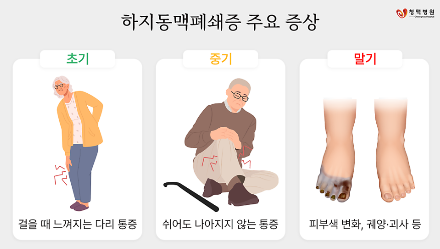 - 초기에는 걸을 때만 다리 통증이 나타나지만, 질환이 진행되면 만성적인 통증과 피로감이 나타날 수 있습니다. 환자는 다리가 항상 무겁고 피곤하게 느껴지며, 이는 정상적인 혈류가 유지되지 않기 때문입니다.