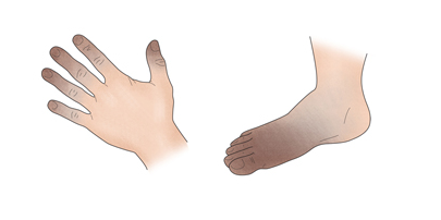 - 괴사성 피부 병변: 혈류가 차단되면 피부의 일부가 괴사하여 상처나 궤양이 생길 수 있습니다. 특히 발가락이나 손끝 같은 말초 부위에서 나타날 수 있습니다.
