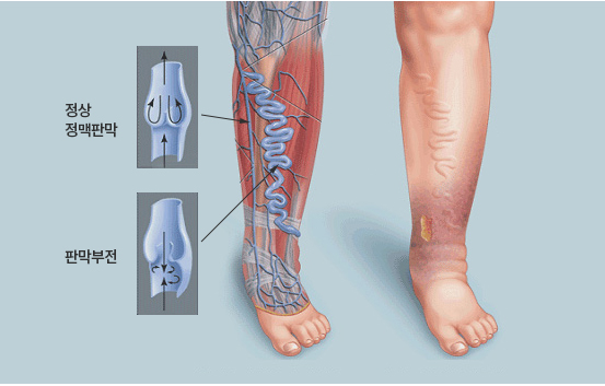 - 하지 정맥 내 압력이 만성적으로 상승하면 판막이 닫히지 못하고 손상될 수 있습니다.