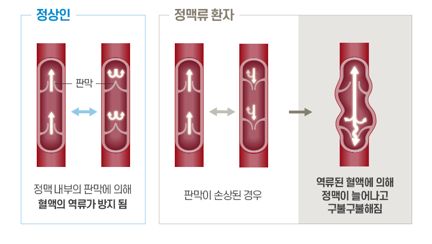 역류정맥류는 하지 정맥 내 판막 기능 이상으로 인해 정맥혈이 심장 방향으로 원활히 흐르지 못하고, 혈액이 역류하여 정맥압이 증가하면서 정맥이 확장되고 꼬불꼬불해진 상태를 말합니다. 주